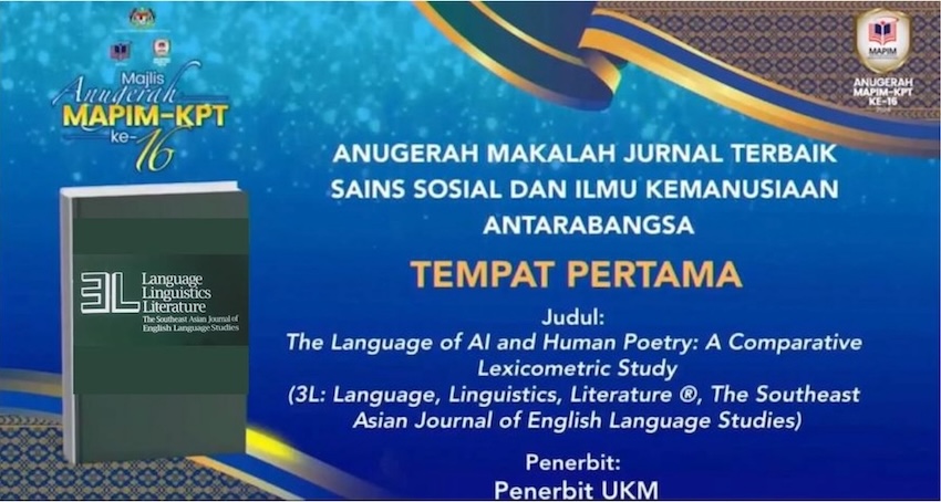 We are pleased to announce that the article titled “The Language of AI and Human Poetry: A Comparative Lexicometric Study” by Assoc. Prof. Dr. Afendi Hamat, published in 3L: Language, Linguistics, Literature® The Southeast Asian Journal of English Language Studies (Vol. 30(3), September 2024), has won the Anugerah MAPIM-KPT ke-16 (16th MAPIM-KPT Award) under the category of Best Journal Article in Humanities and Social Sciences (International Index). The Anugerah MAPIM-KPT is jointly organized by Majlis Penerbitan Ilmiah Malaysia (MAPIM) and the Kementerian Pendidikan Tinggi (KPT), underscoring its national significance in recognizing outstanding scholarly contributions. This recognition not only reflects the exceptional quality of the research and the author’s commitment to advancing scholarly excellence, but also highlights the outstanding scholarly standards of 3L as a journal of international repute. The award affirms the journal’s role in disseminating impactful, rigorous, and innovative scholarship in the humanities and social sciences. We extend our heartfelt congratulations to Assoc. Prof. Dr. Afendi Hamat for this prestigious achievement and express our appreciation to everyone involved in supporting the publication. May this accomplishment continue to inspire excellence in future scholarly works and further elevate the reputation of 3L as a leading platform for academic contributions.